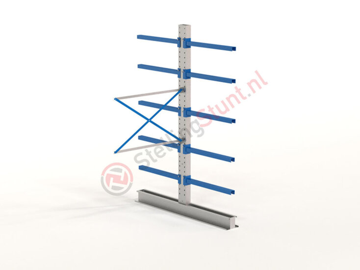 Dit aanbouwvak bestaat uit 1 kolom met 5 niveaus per kolomzijde (1 voet met 5 armen per kolom per zijde). De armen zijn 1000mm lang en de stelling is 2964mm hoog. De h.o.h. afstand is circa 1500mm.